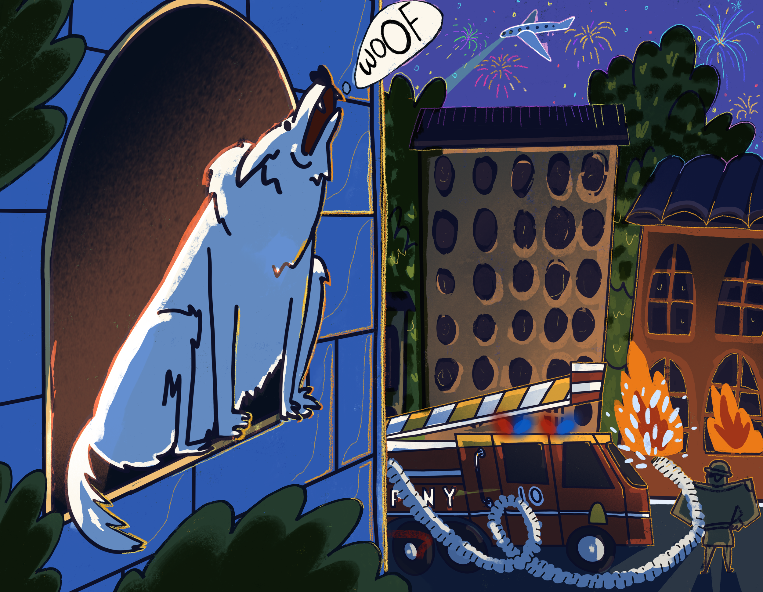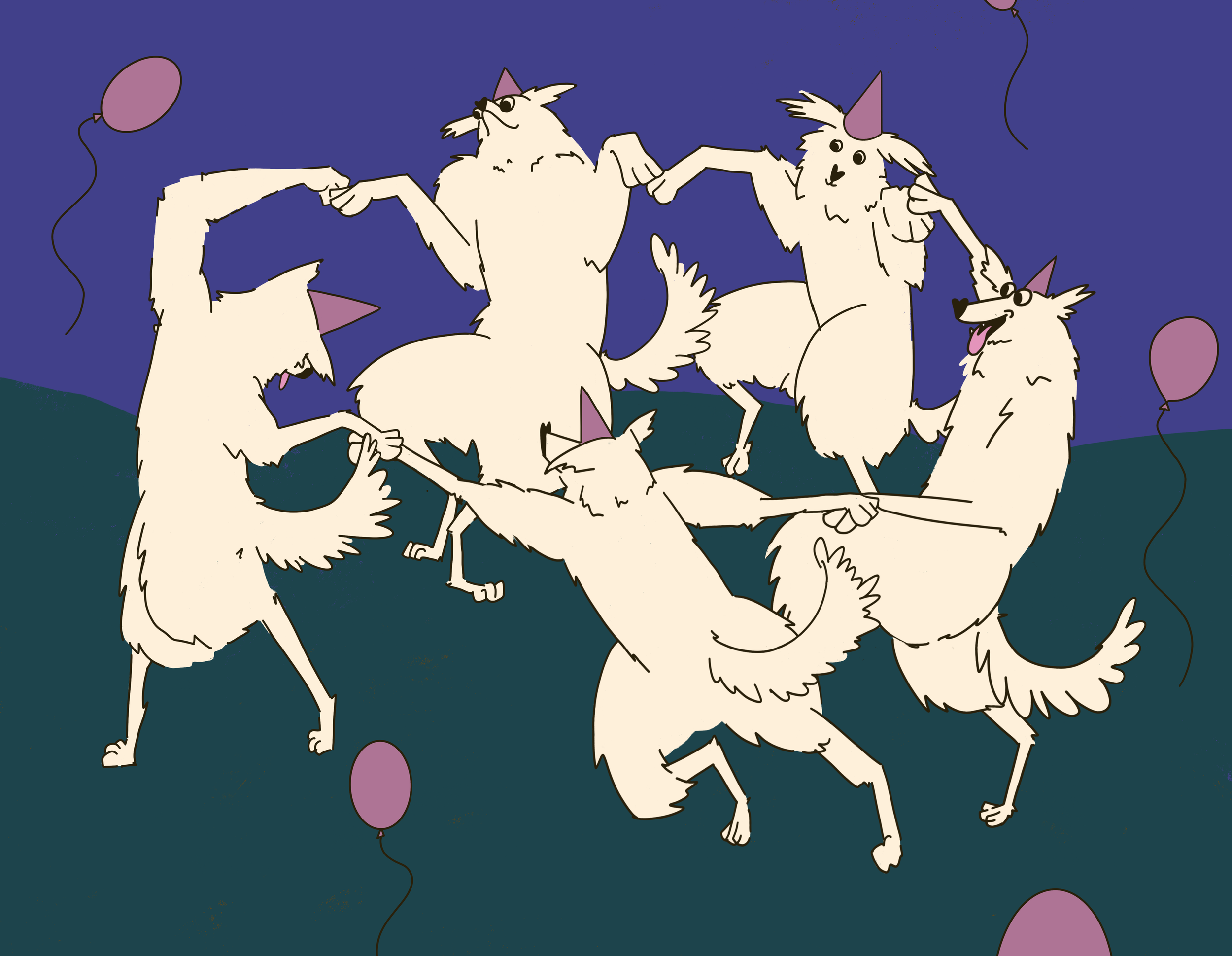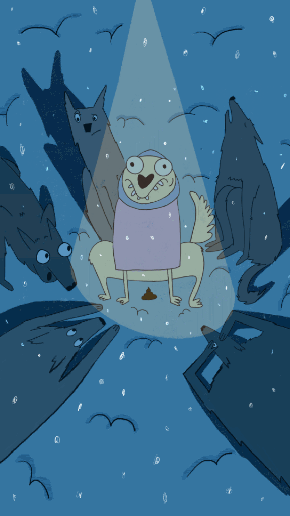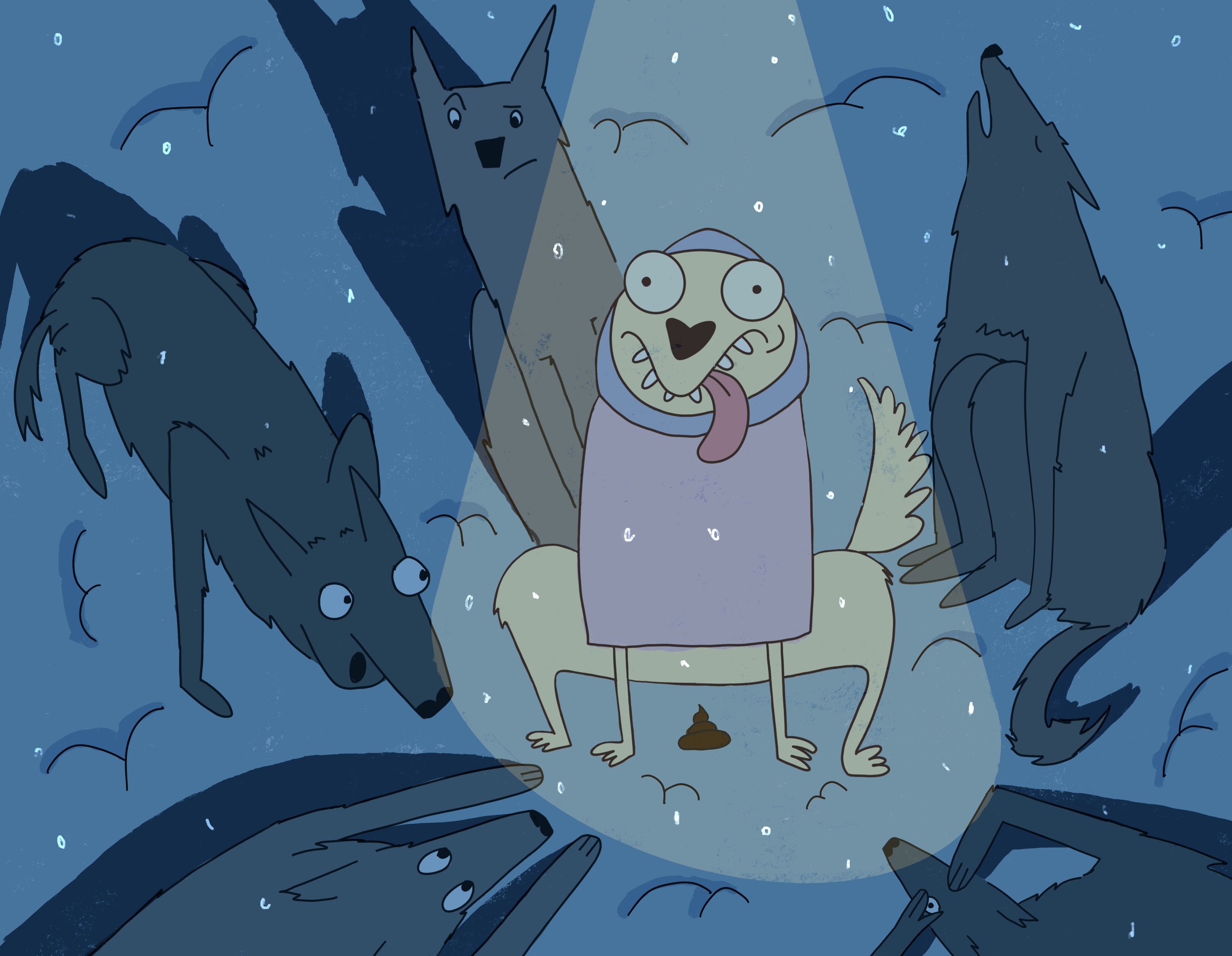 Animated editorial illustration exploring the quiet tension between instinct and evolution. A pampered dog, hoodie on and belly out, does her business in the snow- blissfully unaware of the wild wolves surrounding her, watching with a mix of confusion and curiosity. While wolves remain cautious, never exposing their bellies in the presence of potential threats, this domesticated pup has shed that ancient instinct - protected, oblivious, and perfectly out of place. A humorous yet reflective piece about growth, safety, and what we lose (or gain) when we evolve beyond our roots.
